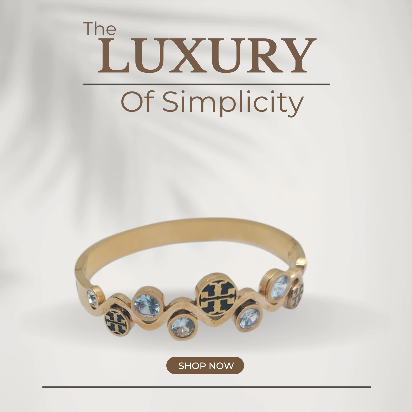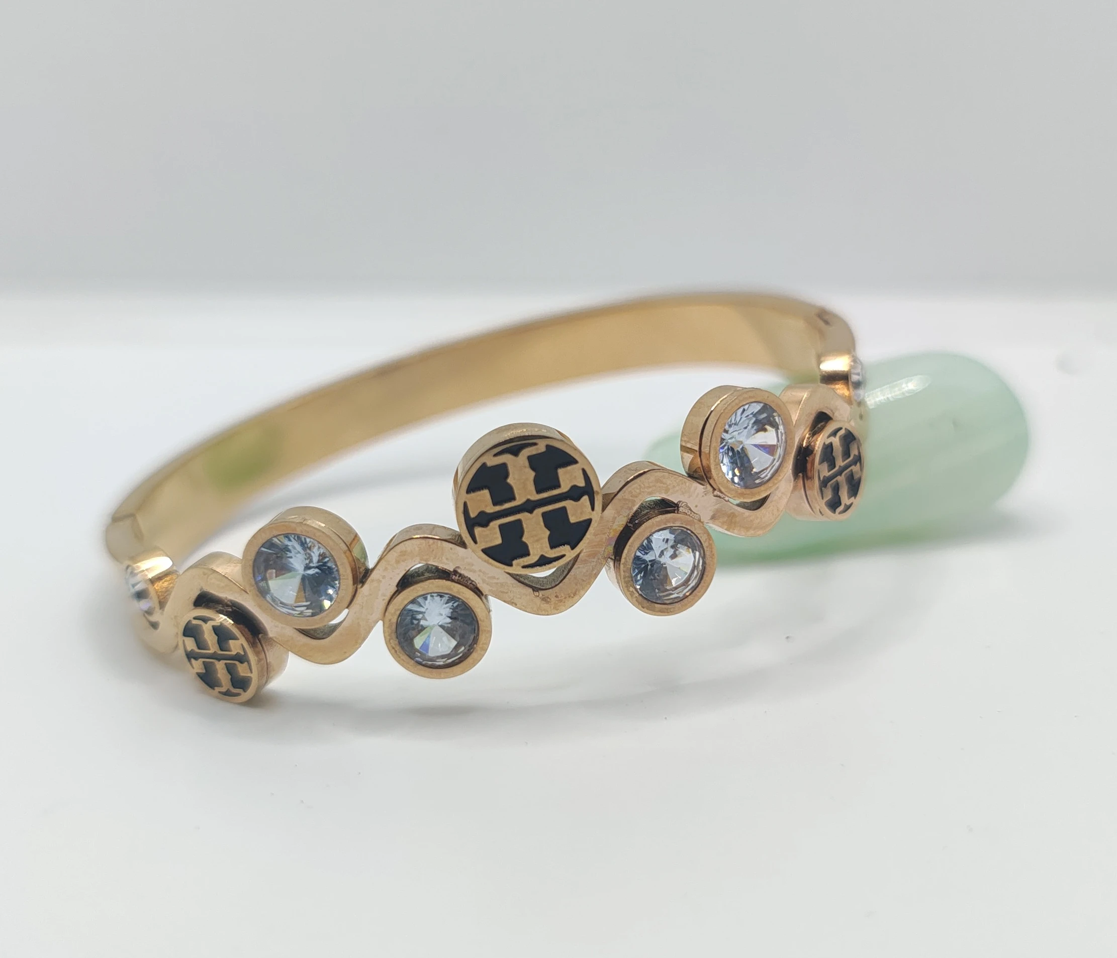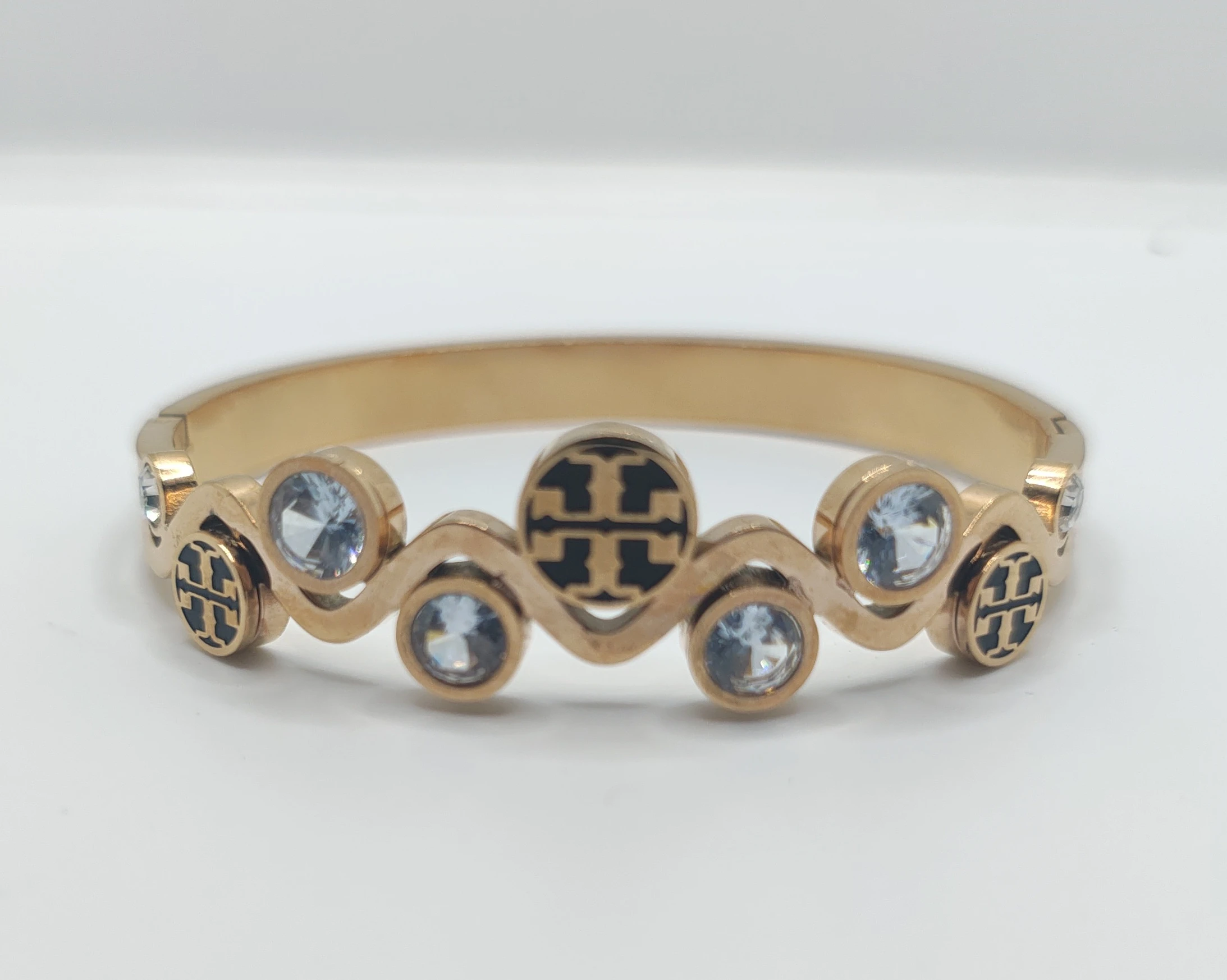 Make a bold style statement with this elegant gold-tone bangle bracelet, crafted with a distinctive wave design that adds a modern twist. The bracelet features alternating round black enamel emblem charms and dazzling crystal studs, creating a striking contrast of elegance and edge. The smooth polished finish and secure clasp closure ensure comfort and durability, making it suitable for both everyday wear and special occasions. Perfect for those who appreciate unique, fashion-forward jewelry with a touch of sophistication.