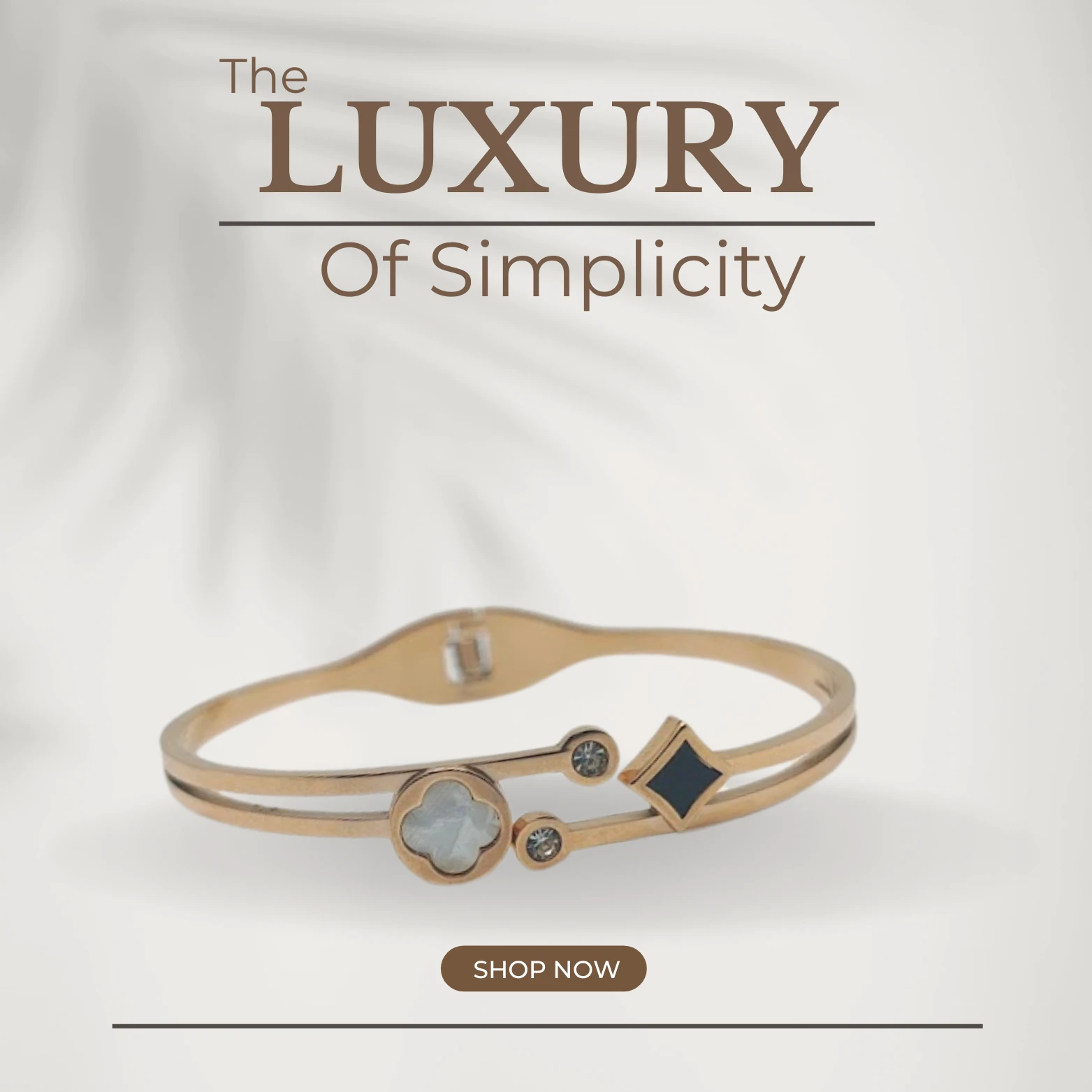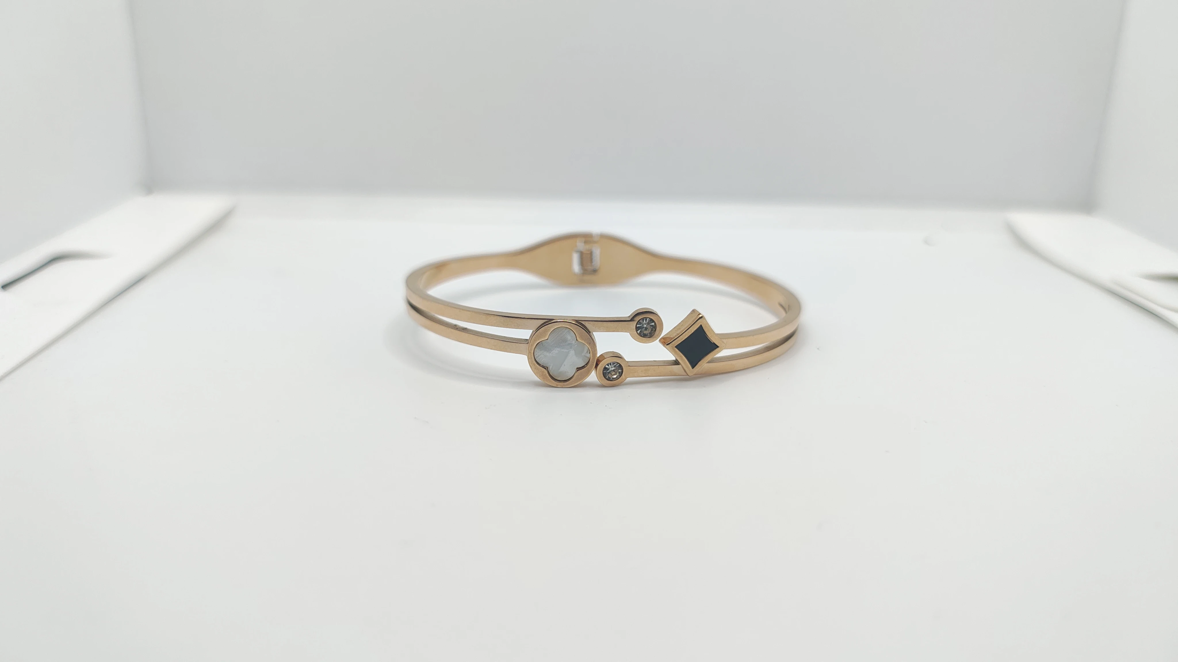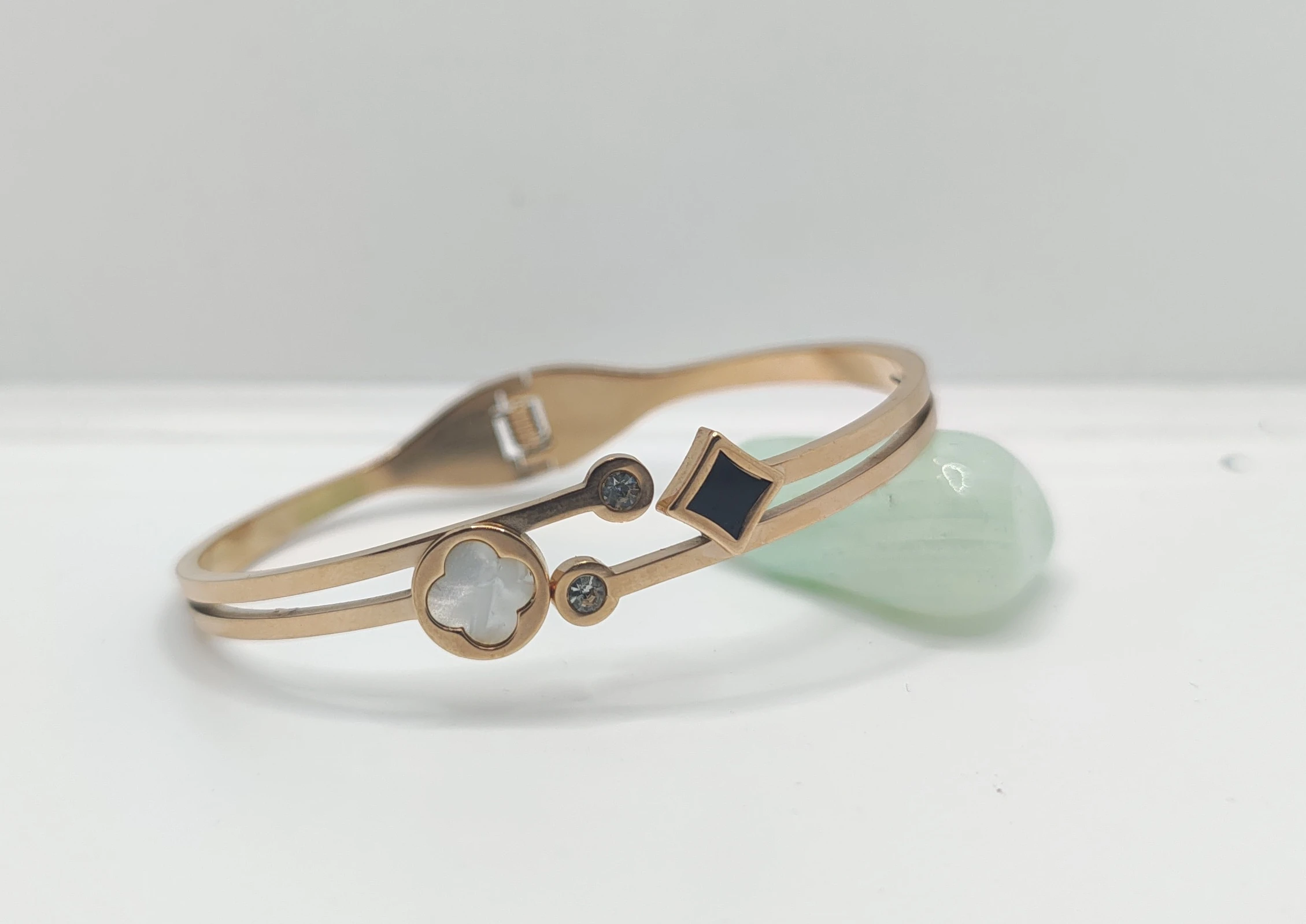 Unique Charms: Adorned with a clover-shaped white mother-of-pearl charm, a black enamel diamond-shaped charm, and two sparkling cubic zirconia stones.