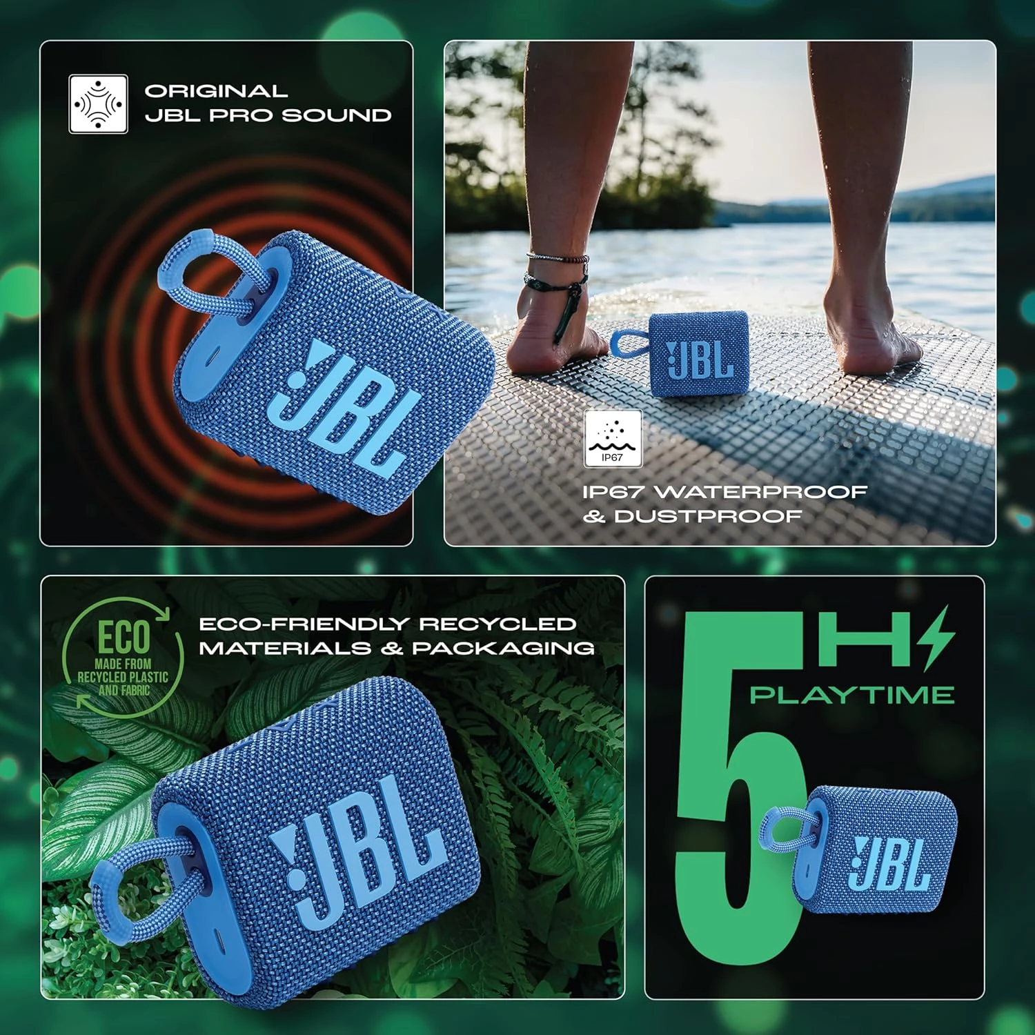 🌱 Eco-Friendly Build: Crafted with up to 90% post-consumer recycled plastic and 100% recycled fabric on the speaker grille — part of JBL’s sustainability initiative.
