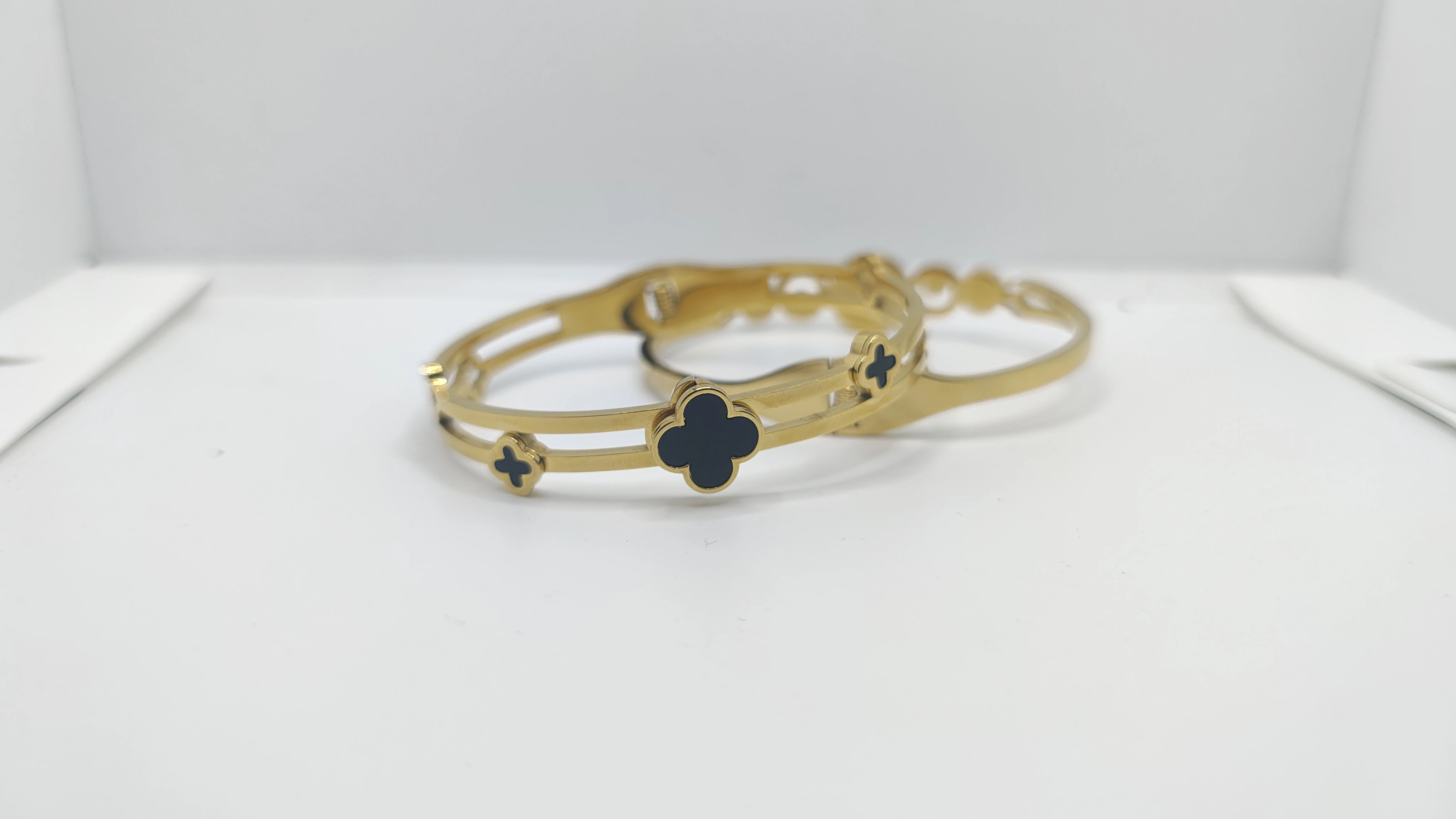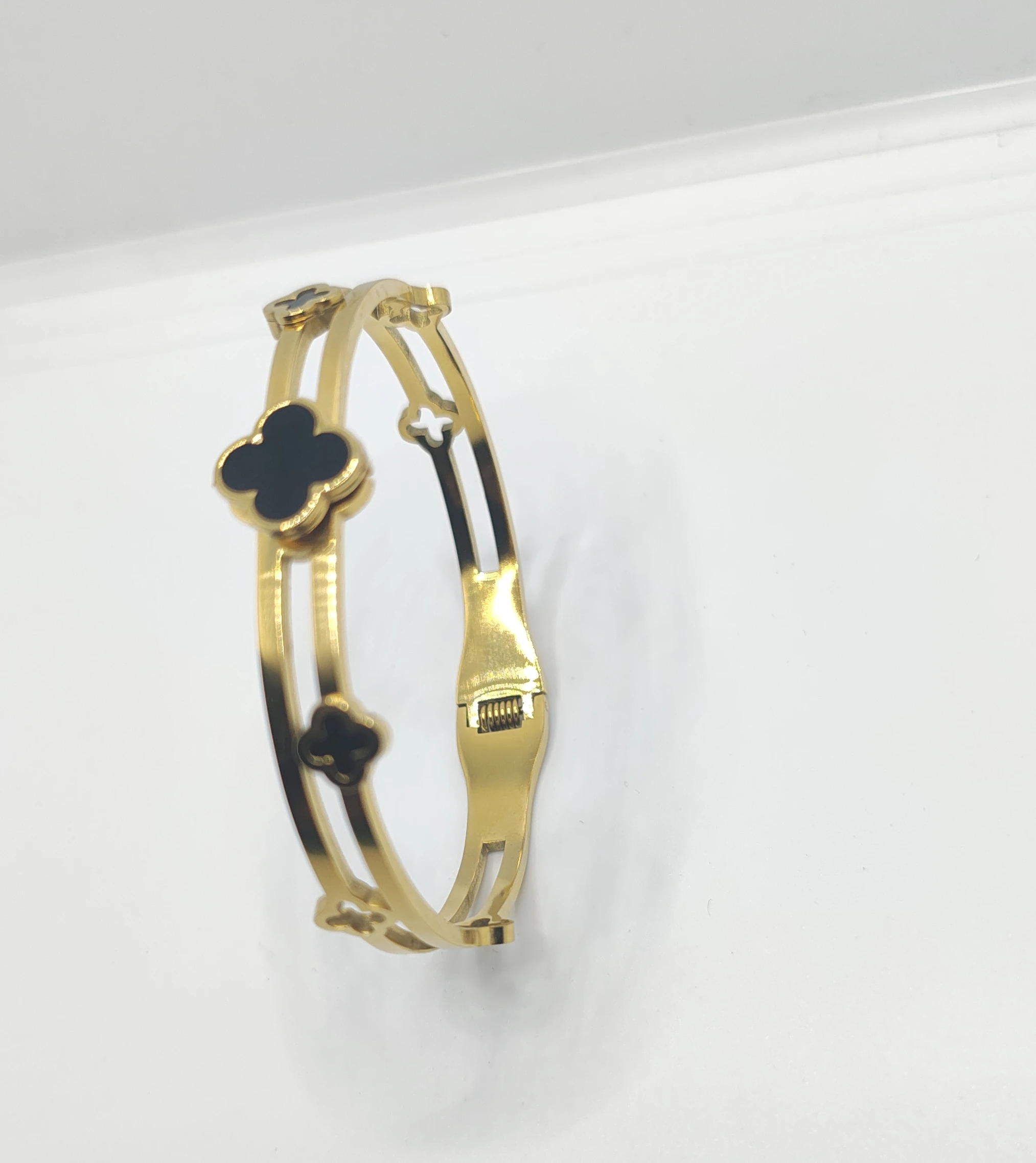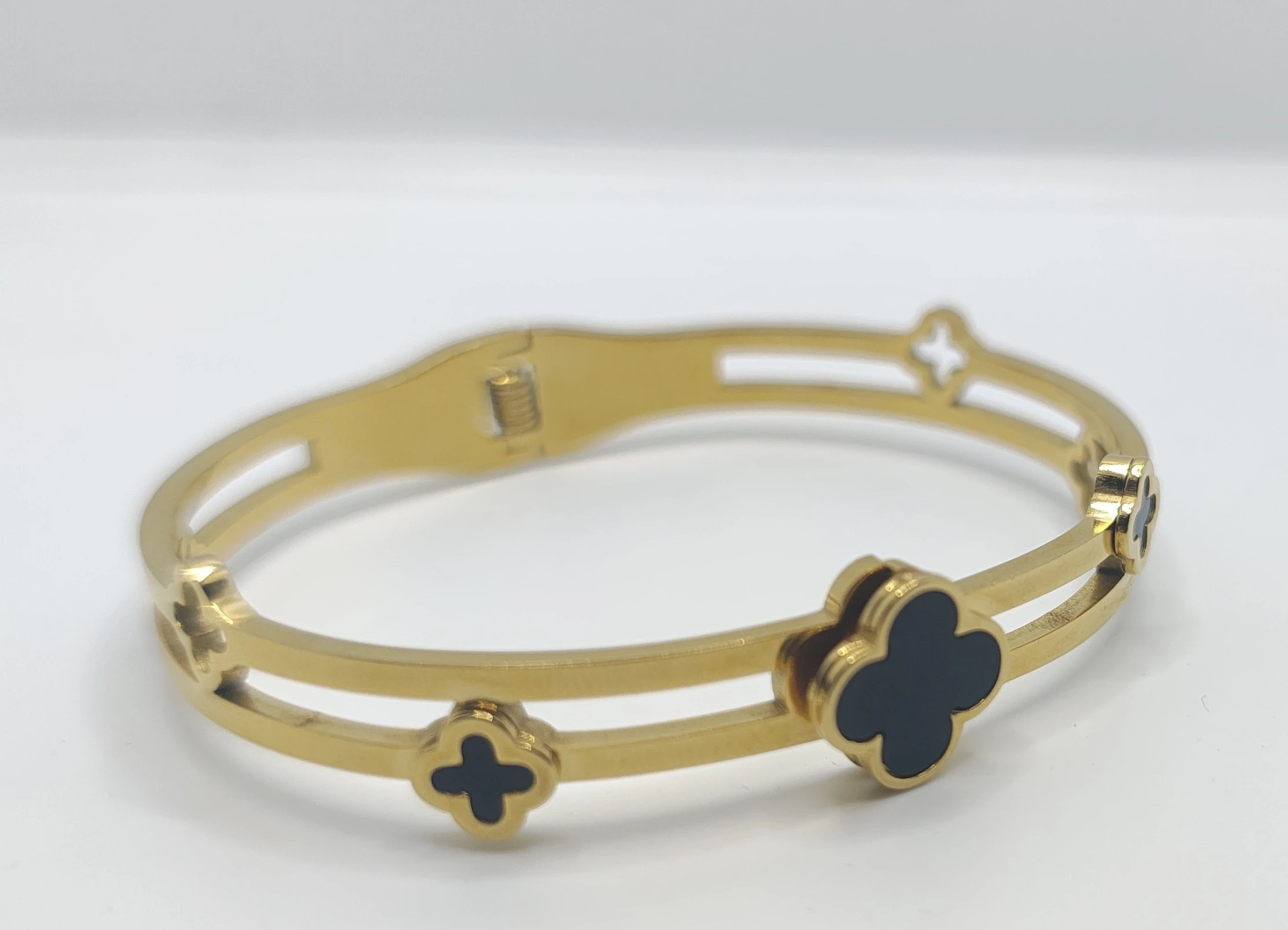 Clover Motifs: Decorated with black enamel four-leaf clover charms that symbolize elegance and good fortune.
