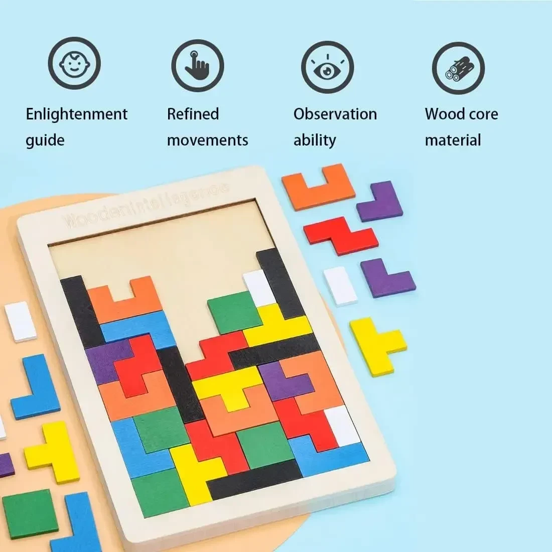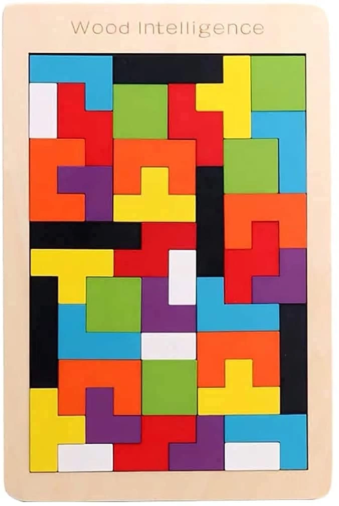 Players fit wooden puzzle pieces onato a tray or board, drawing inspiration from the popular Tetris game.